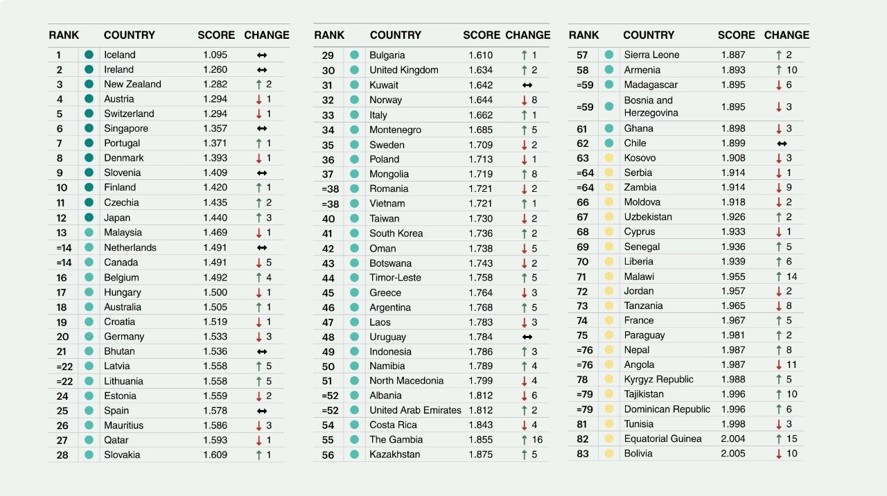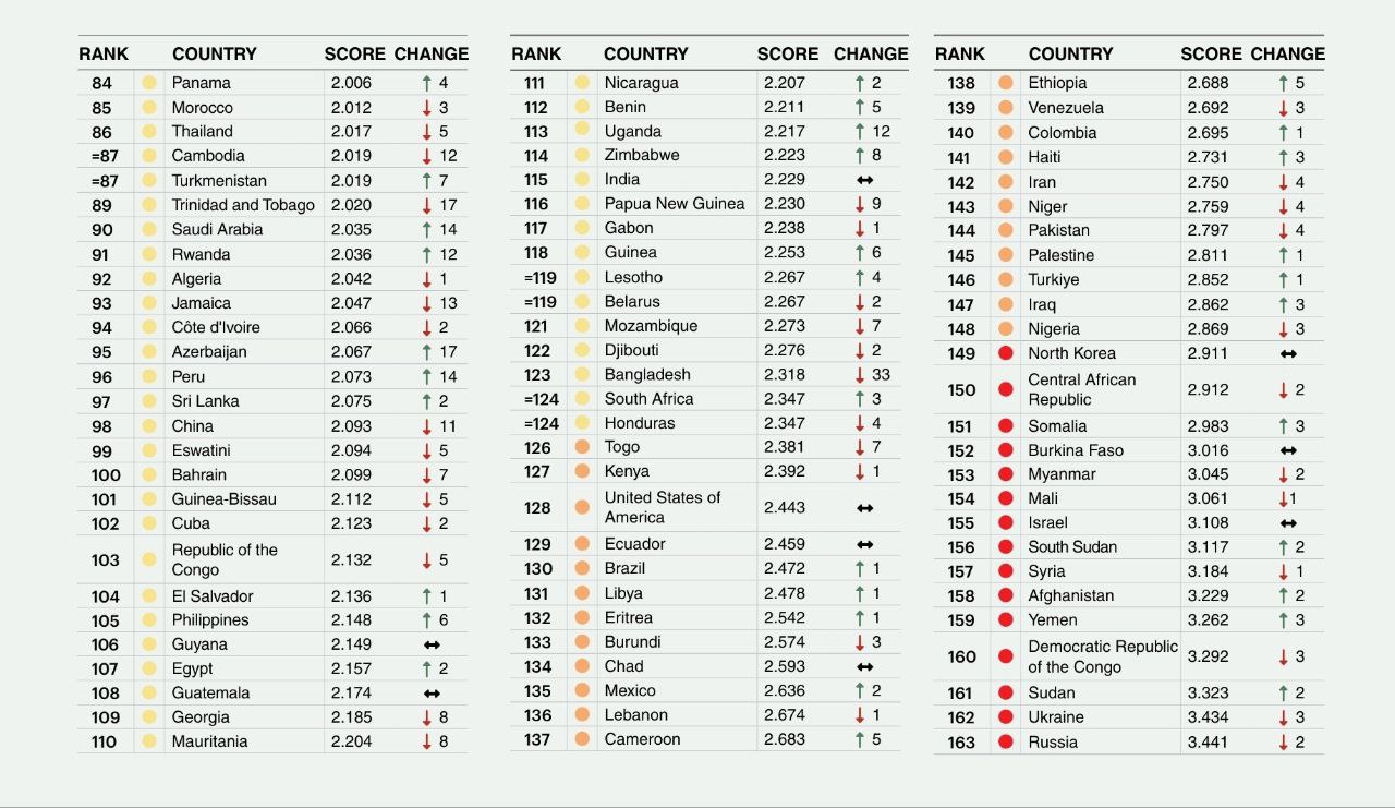أما عالميًا، فقد حافظت آيسلندا على صدارة الدول الأكثر سلامًا، فيما تذيّلت روسيا القائمة في المركز الأخير (163).