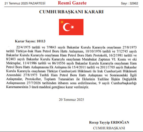 وبحسب القرار، فإن الاتفاق المبرم بين أنقرة وبغداد سيتم إلغاؤه بشكل رسمي في 27 تموز 2026، وذلك وفقاً لما جاء في القرار الصادر بالعدد 10113 من الجريدة الرسمية، وبهذا، تنتهي صلاحية جميع البروتوكولات والوثائق الإضافية المرتبطة بهذا الاتفاق التاريخي.